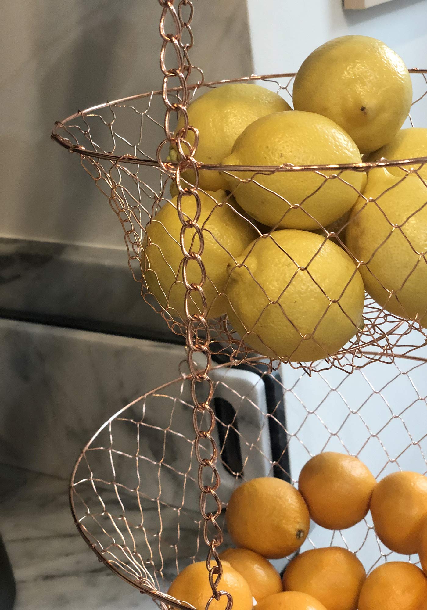 - PRACTICAL AND SLEEK DESIGN: Constructed from sturdy iron wire and with a copper finish, this tiered basket is beautiful enough to serve as an accent piece, while still being subtle enough to blend in to any space.