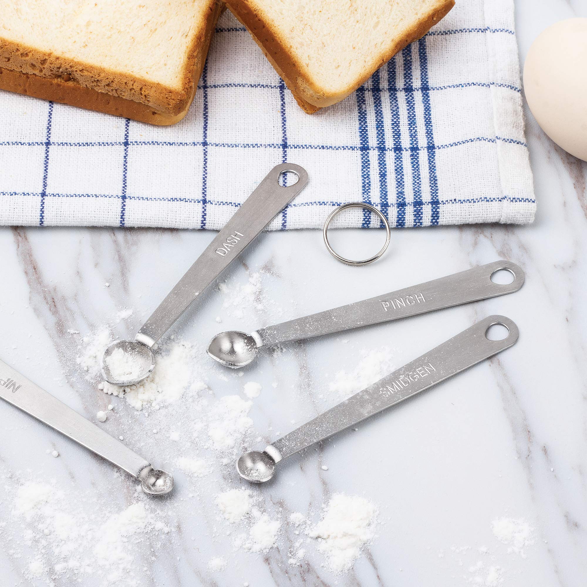 - Includes dash, pinch, smidgen and nip measurements engraved in the metal. The measurements break down to: Dash = 1/8 tsp, Pinch = 1/16 tsp, Smidgen= 1/32 tsp, Nip= 1/64 tsp