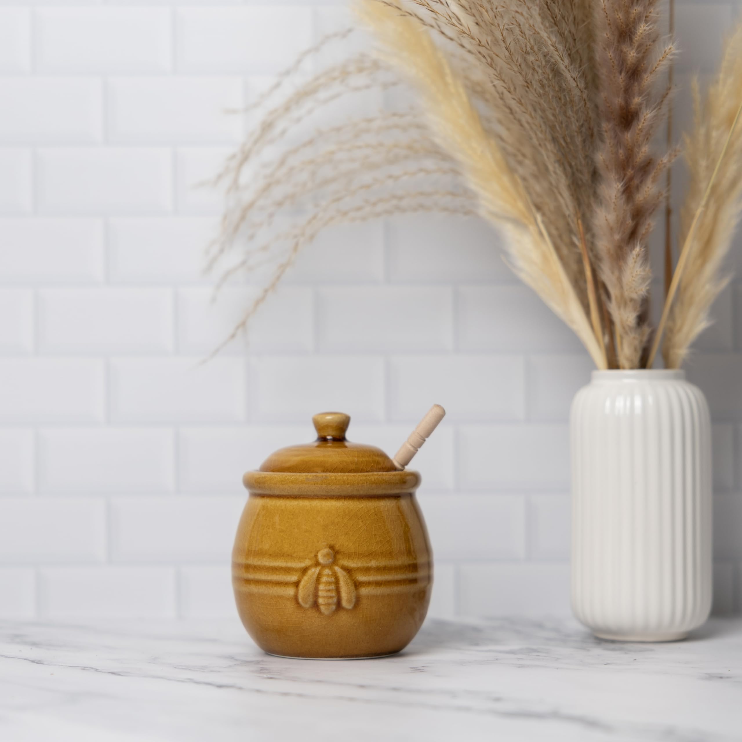 - CUTE CERAMIC HONEY JAR: This honey container is made of timeless ceramic and features a cute bee design so that it adds to the look of your kitchen or dining room while keeping honey fresh!