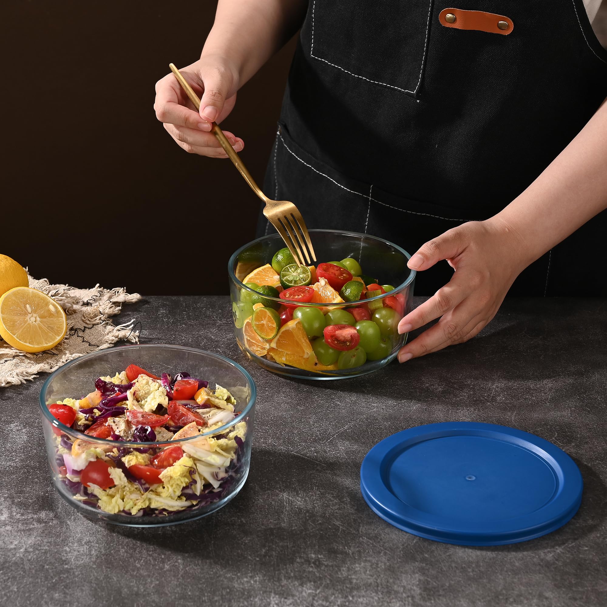 - ALL PURPOSE BOWLS: The glass kitchen bowl set can be used to store, serve, transport, and heat up leftovers, salads, soups, meats, veggies, dips and more. These versatile bowls are a kitchen essential!