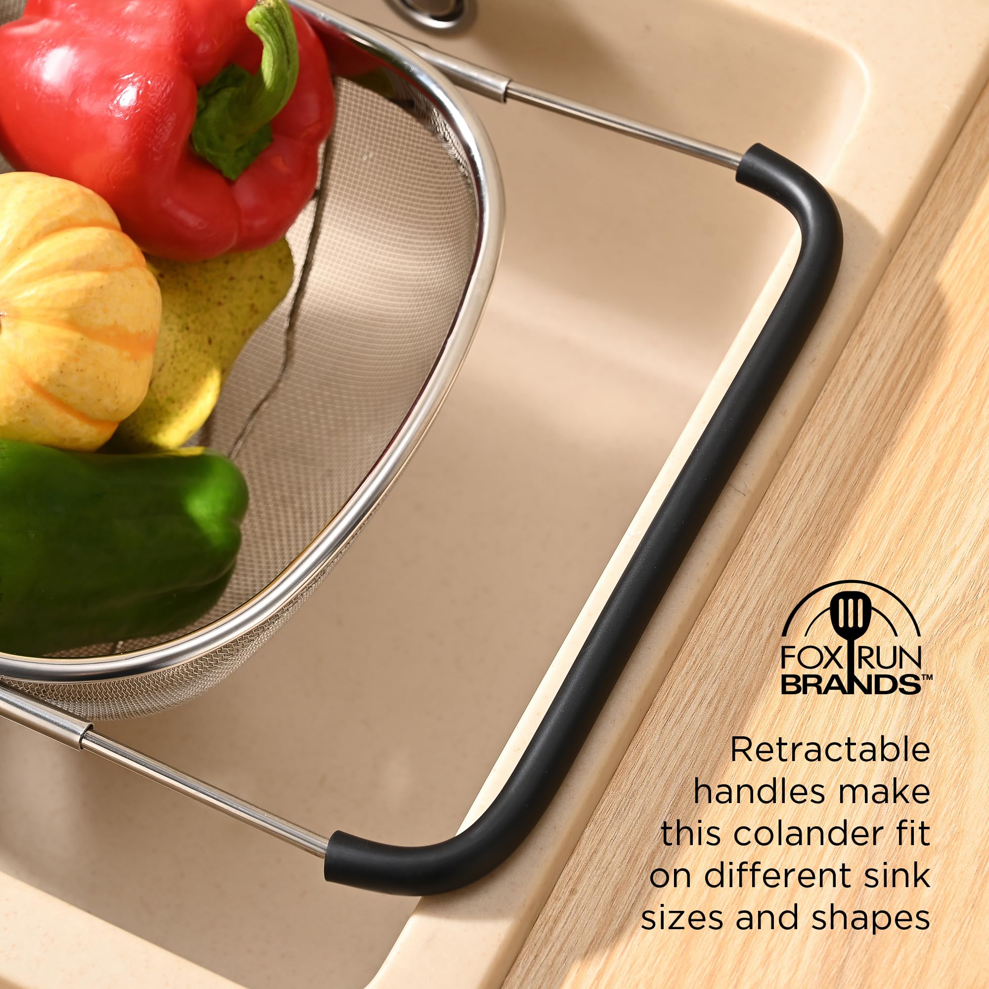 - DRAIN AND STRAIN WITH EASE: Efficiently strain pasta, fruits, vegetables, noodles, beans, and more with this stainless steel colander from Fox Run! This kitchen strainer is designed to drain fast without letting your food slip through while being held above the sink using the retractable handles.
