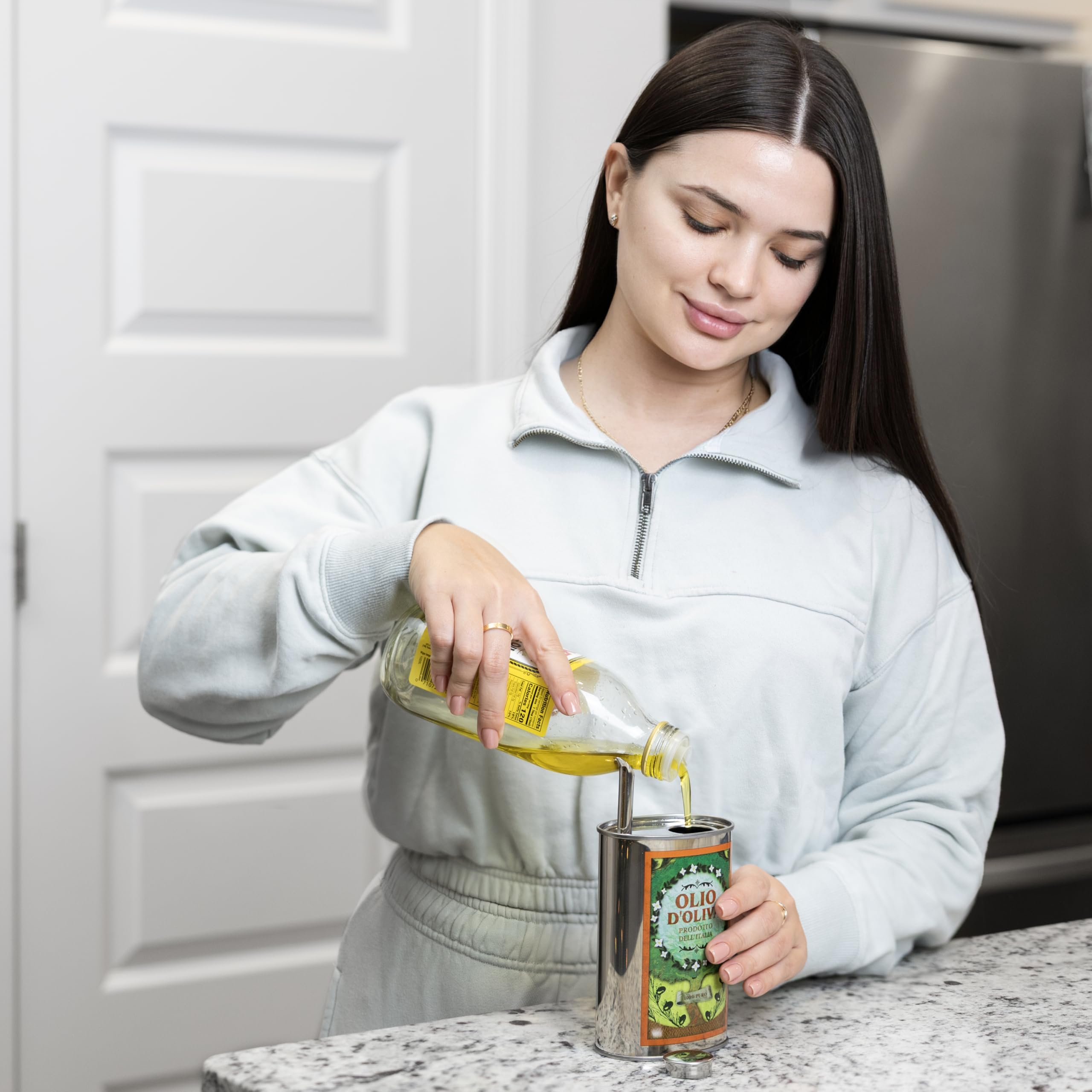 - BEAUTIFUL DESIGN: This durable stainless steel olive oil dispenser bottle comes with a classic Italian themed design and a sleek build, making it a perfect addition to any kitchen aesthetic!