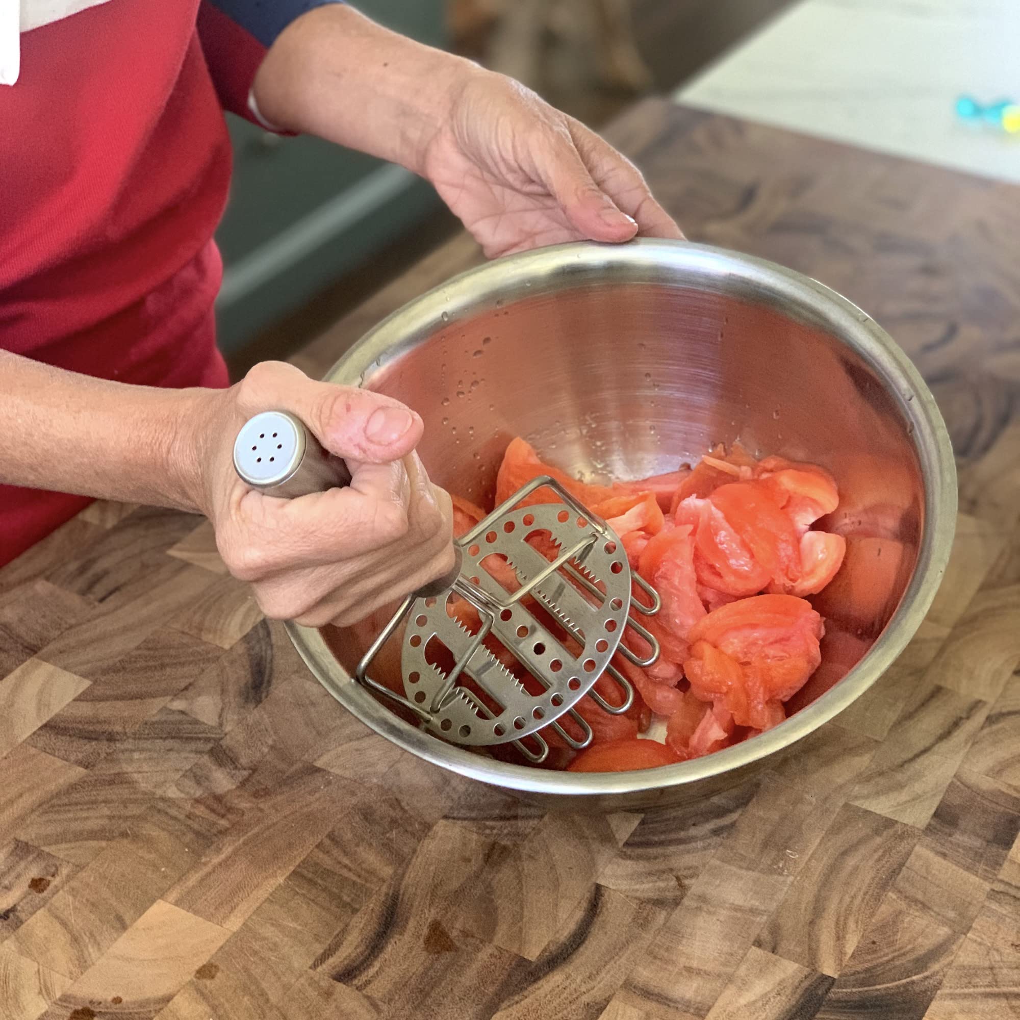 - MASHING MADE EASY: Ergonomic press and release action handle makes it easier to mash tomatoes, potatoes, apples and more. The multi levels save you time and energy compared to the common single level mashers